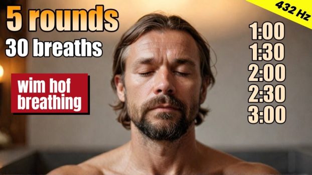 Unlock deep relaxation and inner power with this guided Wim Hof Breathing session: 5 rounds of 30 breaths each, followed by breath retentions from 1:00 to 3:00 minutes, all enhanced with the healing frequency of 432Hz.