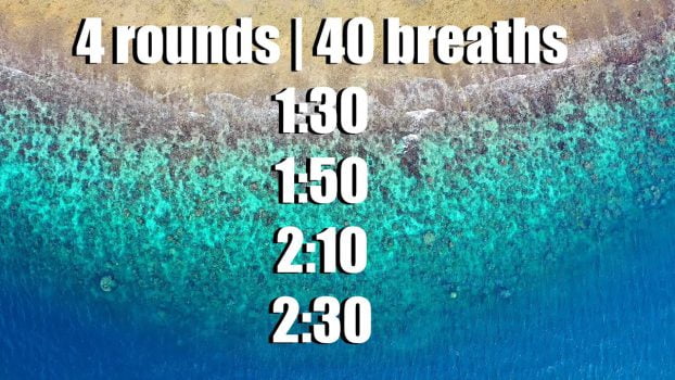 [00:00] round 1) 40 breaths + holding your breath for 1 minute and 30 seconds